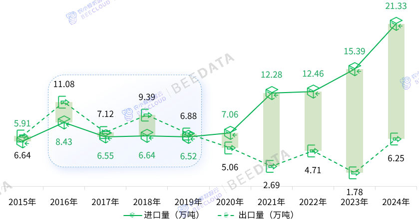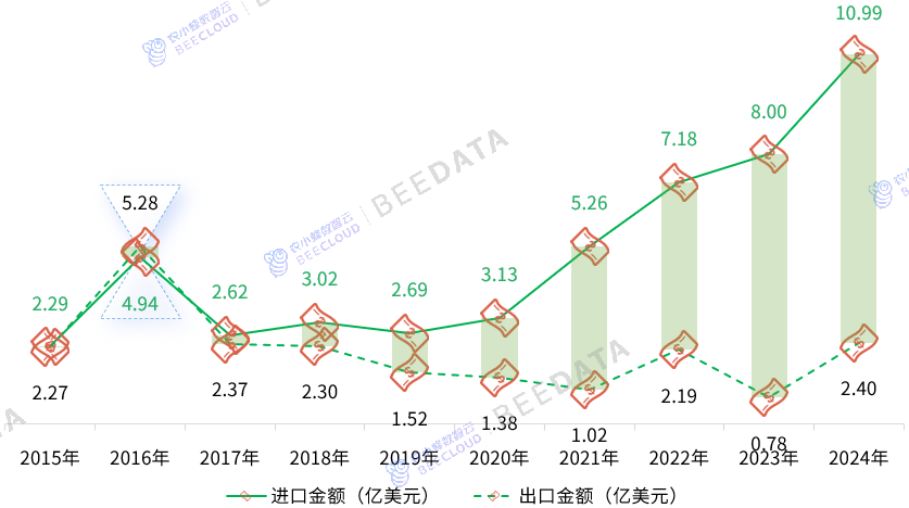 2015年至2024年,中国咖啡进口金额增加了8。7亿美元,增幅约为380。81%,年均复合增加率约为19。06%;