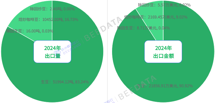 此中,咖啡生豆出口量及出口金额正在全国咖啡出口量及出口金额中所占的比沉别离为83。24%、90。92%;焙炒咖啡豆出口量及出口金额正在全国咖啡出口量及出口金额中所占的比沉别离为16。73%、9。02%;除因生豆和除因炒豆的出口规模均较小,其出口量及出口金额正在全国咖啡出口量及出口金额中所占的比沉均不脚0。1%(千分之一)。