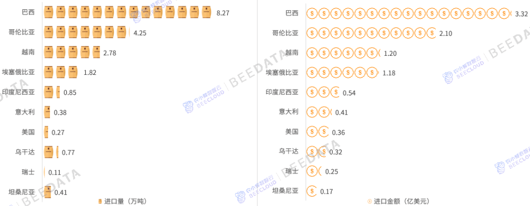 此中,中国从巴西进口的咖啡进口量及进口金额正在全国咖啡进口量及进口金额中所占的比沉别离为38。75%、30。25%;中国从哥伦比亚进口的咖啡进口量及进口金额正在全国咖啡进口量及进口金额中所占的比沉别离为19。91%、19。09%;中国从越南进口的咖啡进口量及进口金额正在全国咖啡进口量及进口金额中所占的比沉别离为13。04%、10。91%。